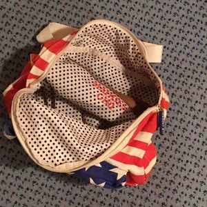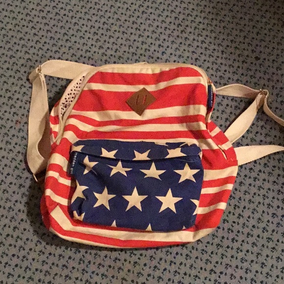 Madden Girl patriotic canvas backpack. Flag motif outside, polka dot inside. 17” long, 16” wide. One pocket on the outside and one pocket on the inside. Great lightweight backpack.