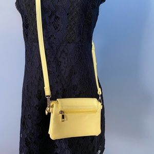 Beautiful Soft Yellow purse with 2 pockets inside and a zip pocket in back. Adjustable or removable strap. Can wear around your waist.