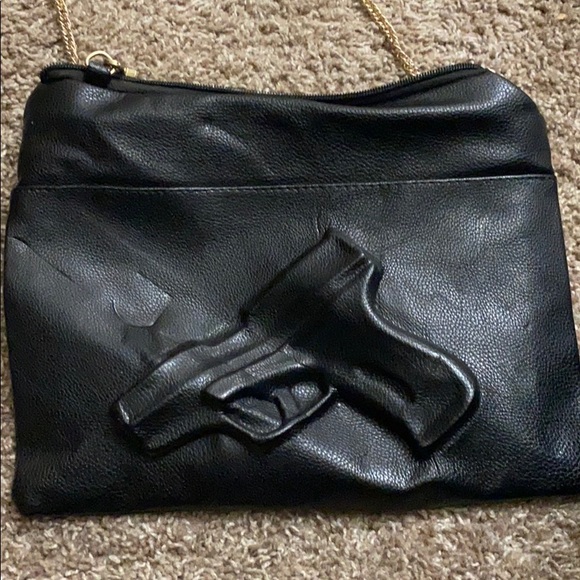 Black purse with gold chain. Has gun imprint on it. Not brand new but in good condition