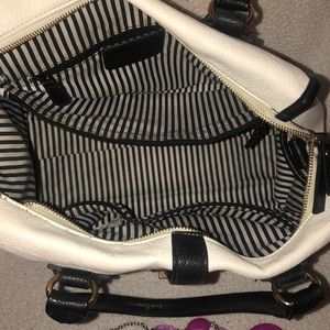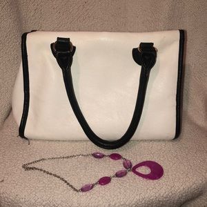 Black and white over the shoulder bag, with storage on the inside as well. Pink necklace included