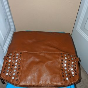 Brown mini purse can be worm as crossbody or wristlet. Damage: scratch on inner fold. Zipper and 2 pockets inside