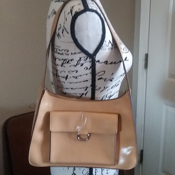 Perfect summer bag, not too large or small. Purchased at JC Penney. A few marks on back. Made in China Simulated Leather.