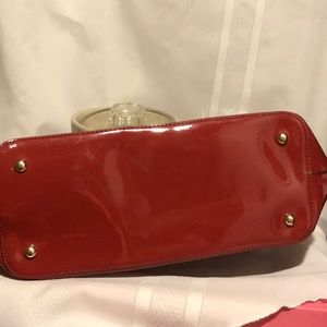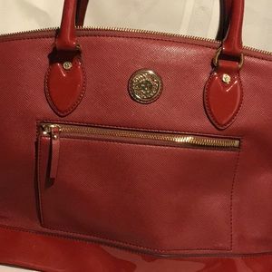 Anne Kline Purse; red with black lining; 15” wide and 10” tall; Leather with plastic bottom and handles.