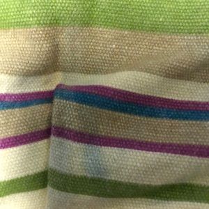 Multi Color, Mostly Canvas. Snap Closure. Small Amount Of Light Blue Coloring On Bottom Front.
