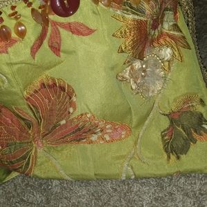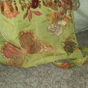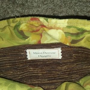 Unique purse excellent condition. It's a very spacious purse for the size that it is, a lot of compartments and zippers on the inside. Very nice beating around the top of the purse at the side and has a little string that you can tie or leave hanging. By the strap it has the same string that you can put the end of the strap in so it doesn't hang. It's made by Mona Derrow. Check her website out to see more items. Love her items this purse is different and fun, great conversation