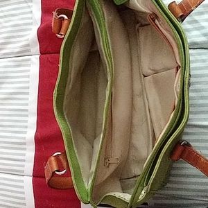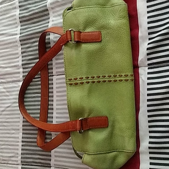 Green leather purse . two handles straps..two compartments inside ..card pockets.one zipper pocket also ..in good condition