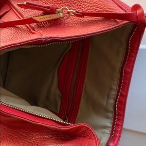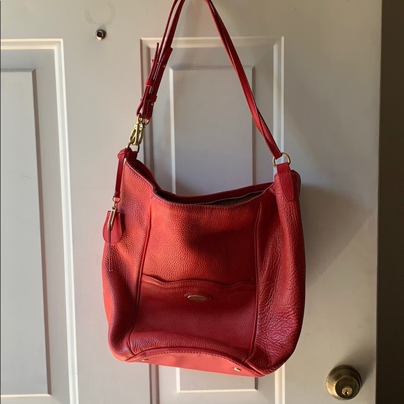Scarlet shoulder bag with 2 compartments that snap shut. One compartment on the front, one inside. The whole bag zips shut for security. Metal feet on the bottom to prevent scratches to the bag when it is standing.