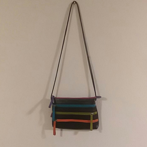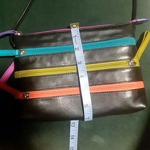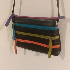 Black leather New York shoulder bag w/colored zippers. Very cute and genuine leather. Very good condition.