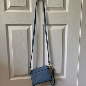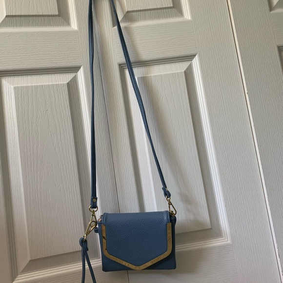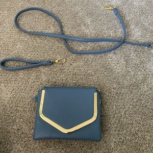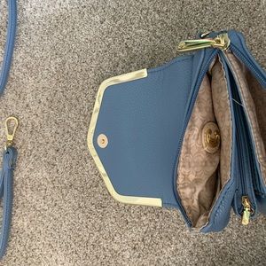 Blue purse with gold lining and adjustable length. This purse has detachable straps so it can be a shoulder purse or a clutch.
