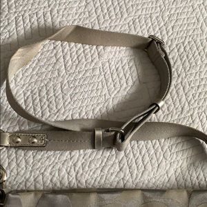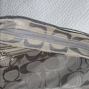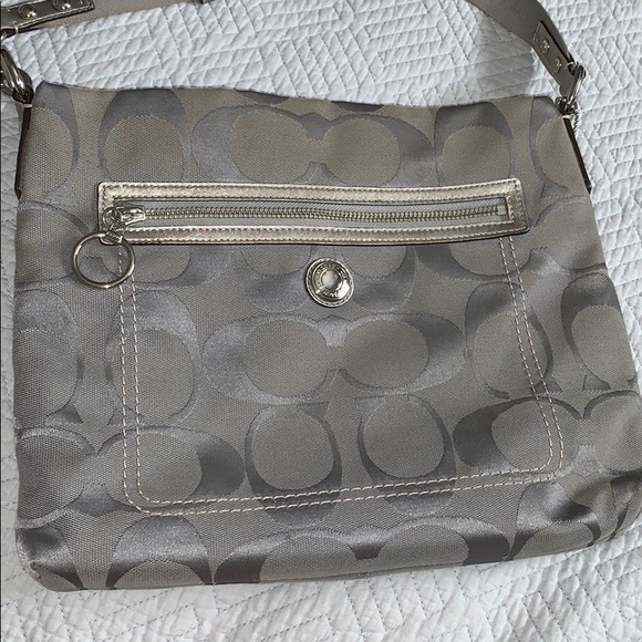 coach crossbody gray. Small pocket in the back is a little stained from rusted pennies that were in there. Normal wear, some stains on the strap