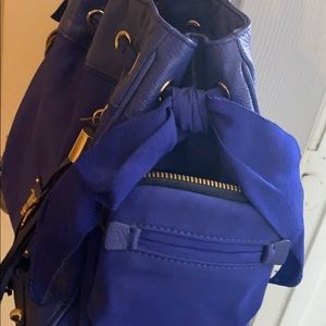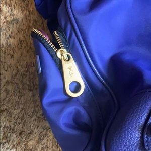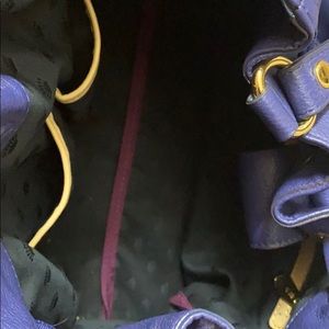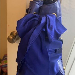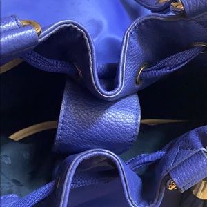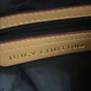 A royal blue with gold juicy couture purse has pockets on both sides of purse also has a ribbon throughout entire purse and comes together on the right and left side of the purse into bow ties . It’s does have some water mark dots that you can view in the picture on the back side . It is a little hard to see but they are there