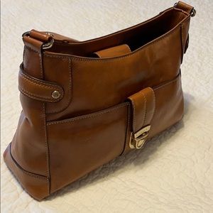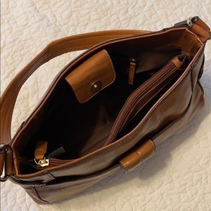 Light brown Liz Claiborne shoulder bag with outer clasp pocket, middle zip pocket, and inside back zipper pocket.