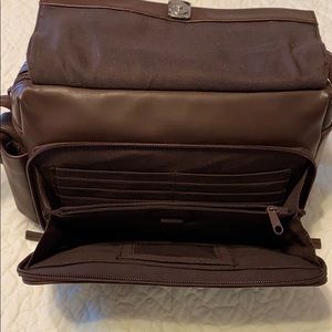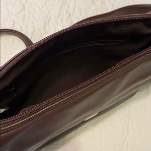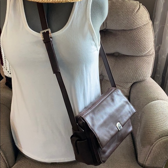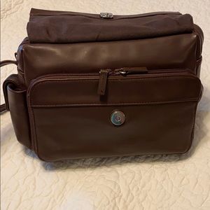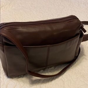 Brown leather purse with end pocket and a back pocket. It has a front zippered pocket that has card holders and pockets in it. It is covered with an overlapping snap. The middle zippered pocket has a smaller zippered pocket in it.