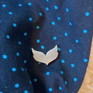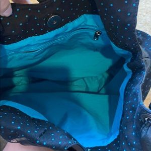 Snap close, one zipper inside. Black with baby blue polka dots. Straps are faux leather looking/plastic