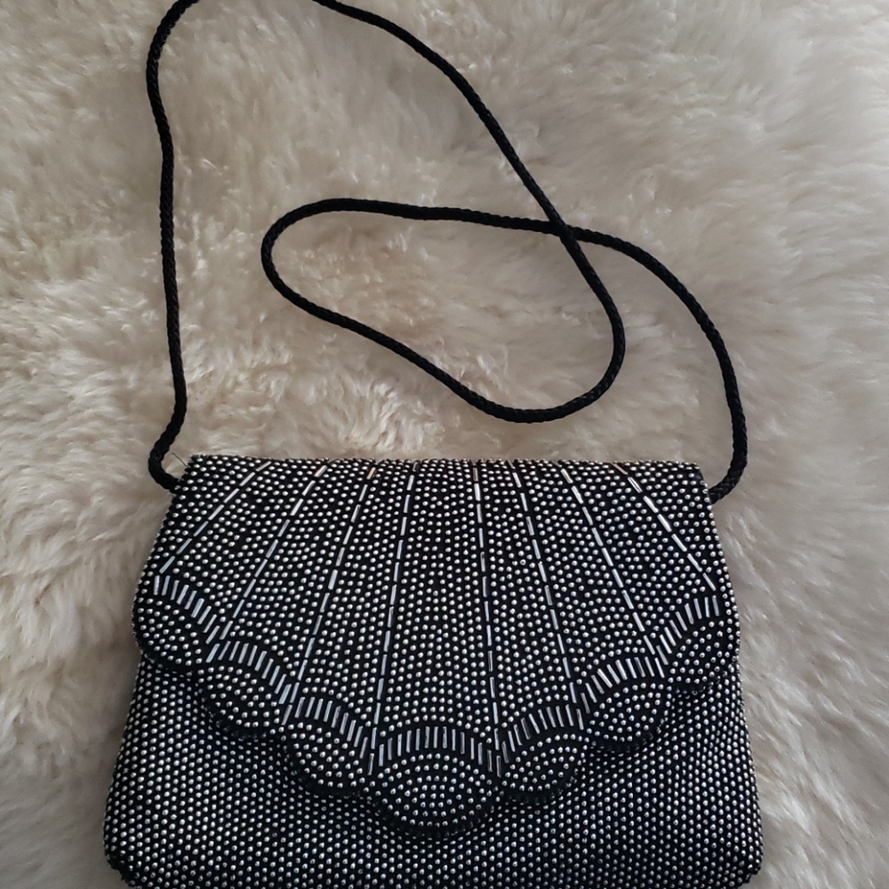 Black with silver embleshments with over the shoulder light weight strap. Strap can be easily strapped in to use as a clutch. Pockets on both sides. Great shape.