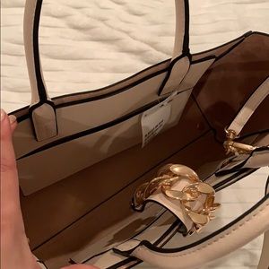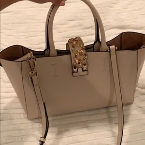 A creme colored purse with handles in addition to a long body strap. Comes with gold latches that really make the purse stand out. The texture is leathery so it’s very easy to clean if need be. It has never been worn and is still in very good condition.