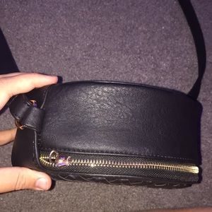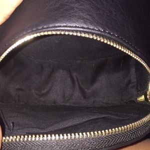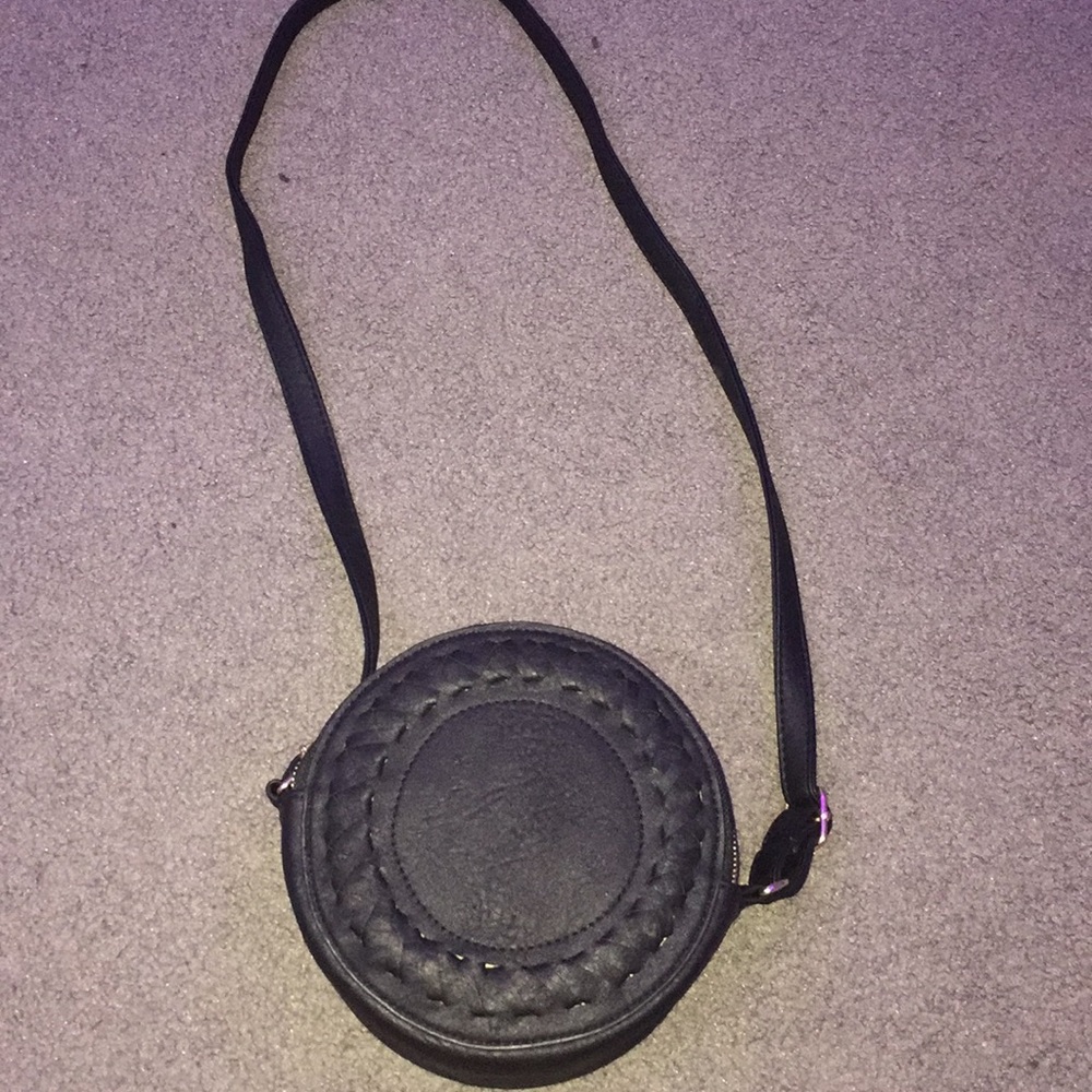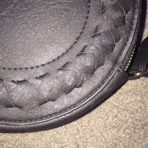 Round black leather purse with braiding around outside of front with gold zipper and adjustable strap