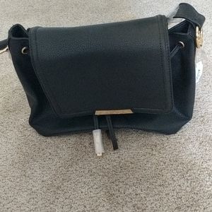 Black hobo bag with draw string and flap to make sure things don't fall out. Zipper pocket on the outside back. And a zipper pocket on the inside. Gold details! Never used