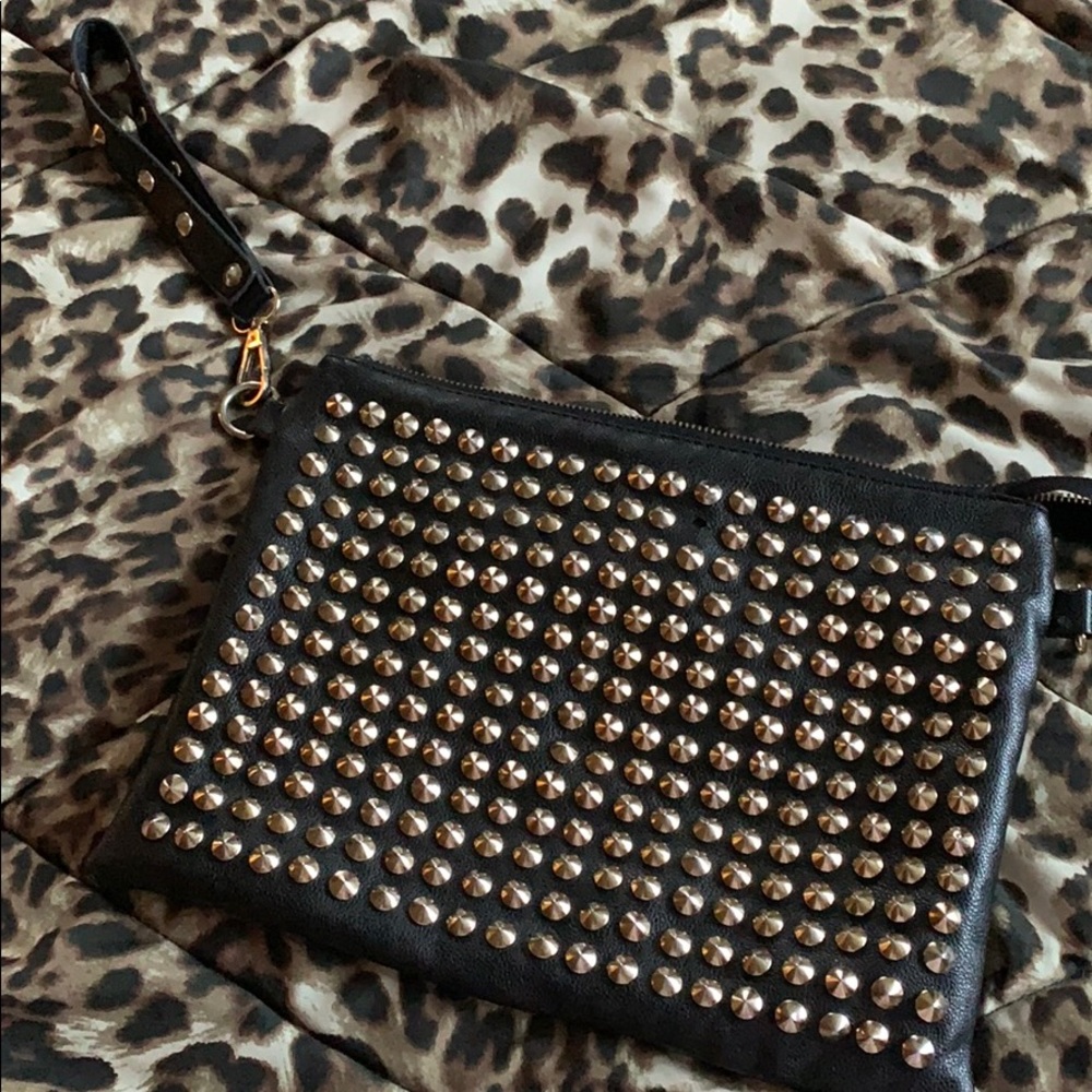 Gold studded clutch with wrist handle