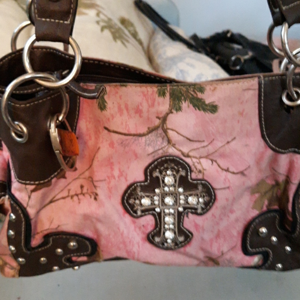 Pink the design or leaves and tree branches it the women version of camo when they first came out everyone had to have one zip clousure pocket on inside and 2 other, 2 side pocket on outside and zip closed