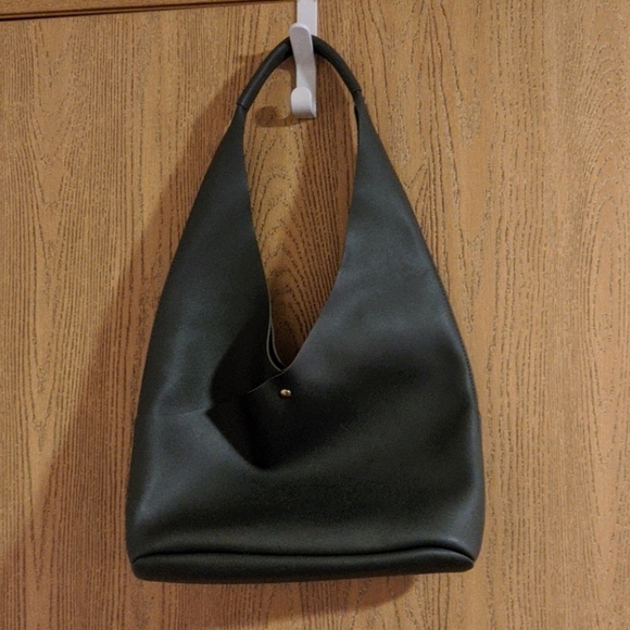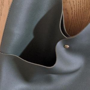 Green. Sides cross over creating another pocket on each side. Reinforced over the shoulder. Gold colored magnetic closure