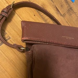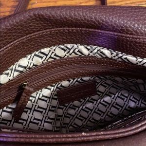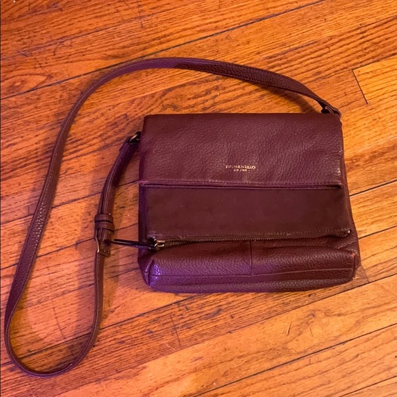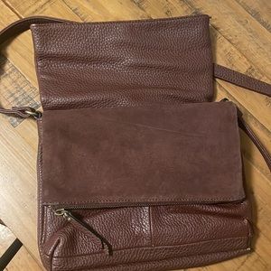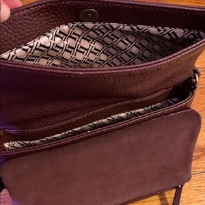 Dark maroon crossbody strap purse. Has a back outside pocket, a large zipper close flap pocket, a large button close flap pocket, and then the main purse compartment that has a zipper pocket inside, 2 little pockets inside and credit card slots with RFID protection. Lots of organization for storage!
