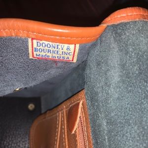 Dooney & Bourk, all Leather blue trimmed in brown. It has a little wear and tear , but great for wearing to do little shopping.