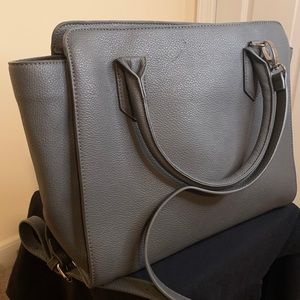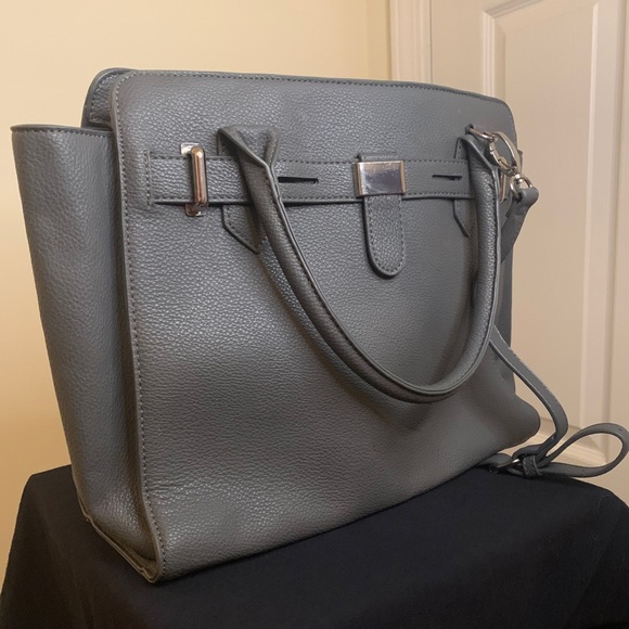 Beautiful dark gray purse. The material is faux leather and the outside hardware color is silver, two pockets inside one zipper close the other is interior. It’s 6” deep. It does have a small scratch on the back you can see more details on the pictures posted.