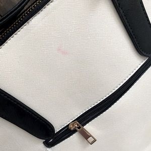 Gold accents, plenty of space inside, small stain on one side, cream color.
