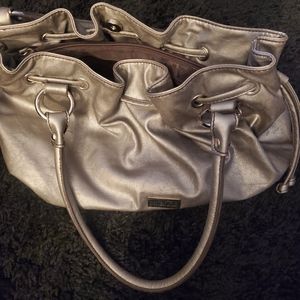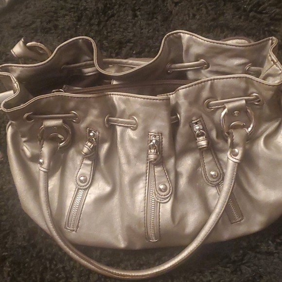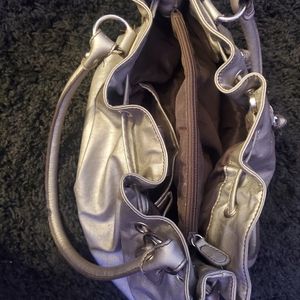Cute, grayish/silver, medium sized purse. Separates into 3 sections on the inside- the middle contains a zipper pocket with a section on each side. The back of the purse also contains 2 zipper pockets and closes at the top with a button clasp