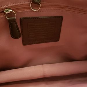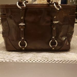 Brown Tote Patent Leather, This is a medium size and inside is a pink sateen lining with zippered pocket and two slip pouches, great condition