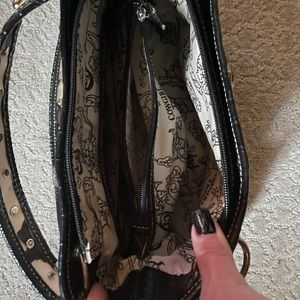 Purse with silver cross on the front many pockets on the inside just what a woman needs