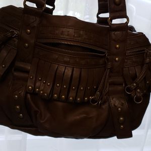Brown leather fringe satchel with bronze studs,2 zipped side pockets and front zipped pocket