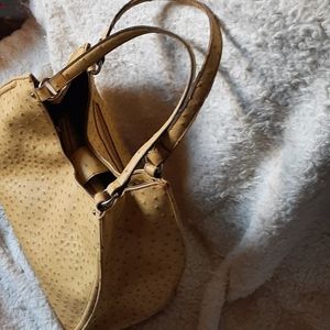Yellow, ostrich look alike, Large, several compartments, double handle, snap, new and never used. Nice, and good quality bag. Idk the brand as it was in a storage unit we purchased, and we couldn't find a tag or anything to verify a brand, however IMO it seems to feel pretty good quality.