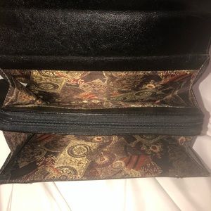 Two outside compartments expand. Center compartment zips. Removable strap. Inside credit card holder and pen holder.