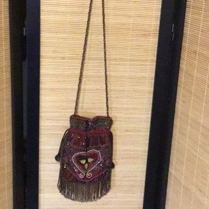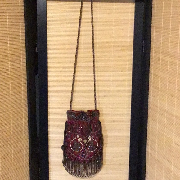 7 x 9 drawstring beaded bag with beaded 23” strap.beautiful wine color.