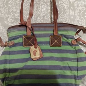 1975 Dooney and Burke purse blue and green stripe outside. Pink inside