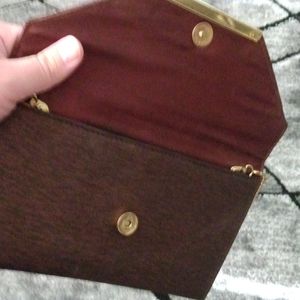 Small stylish, clutch with gold colored chain. Perfect for going out to the club, weddings, special occasions.