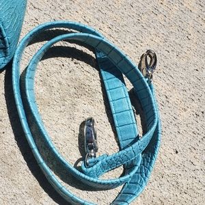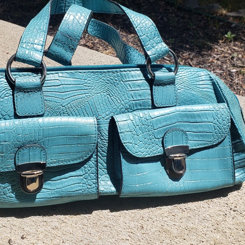 Leather snakeskin blue teal purse. Long strap included for versatility. Wear shown in photos. Apostrophe brand. Great condition.