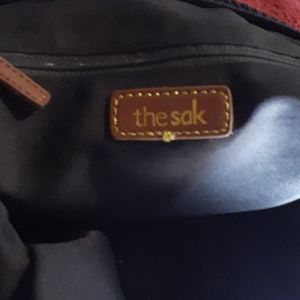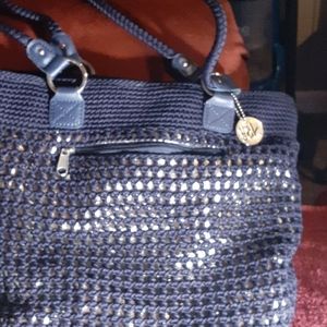 Black ,braided handles , crochet over gold , side zipper inside and out ,looks new used about a week .