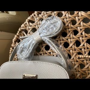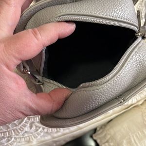 Cute and petite Jessica more over the shoulder purse. Dimensions are about 5 1/2 Inches high and 6 1/2 inches wide and about 6 inches deep. Inside is clean never used brand new little side pocket. Petite enough to carry your essentials for the evening. Strap is adjustable and the purse zipper clothes. Is similar to a clay gray. Texture is soft inside is lined. Protective satchel is included. No trades please price is firm.