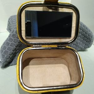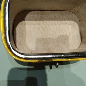 Bright Yellow with Silver decorating. Some scuff marks on bottom. Lining good stained some from sitting and using. Yellow handle with wear on handle from carrying. Plastic ?? Purse a little glossy 1950's guessing.