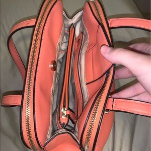 coral colored purse. 2 outer zippers. 2 pockets inside and 2 zippers in the middle portion. bottom is 11.5”. 5” wide. 8” tall.