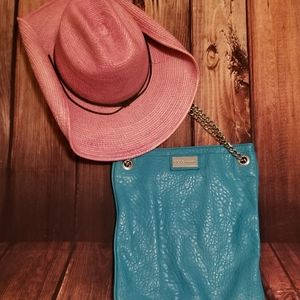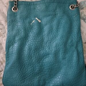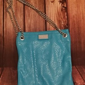 You have a teal BCBG purse with silver chain straps. It is medium in size.