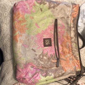 Grey Sak purse for sale. Great bag, awesome studded detail. On the back side of the purse, there are some signs of wear, look like some coloring from a pair of jeans.