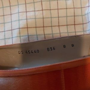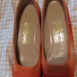 Pretty orange linen Ferragamo flats in good condition. The inside right heel has a black mark that is noticable. There's a small black mark on the inside left heel. 1 in heel. Size 8 B