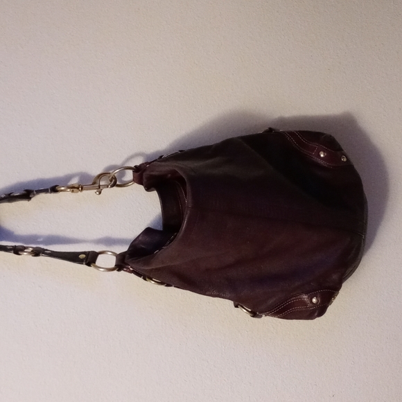 Brown shoulder bag purple inside with gold accents