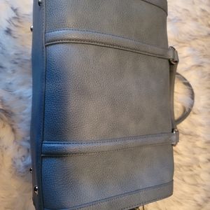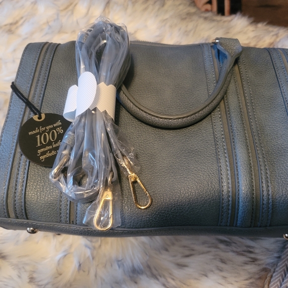 Leather purse with man made trim...gold toned hardware...shoulder strap...3 interior pockets..one is zippered...lined..2 handles..Cornflour blue