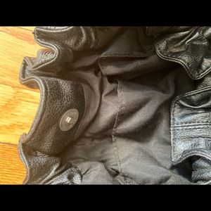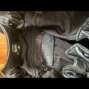 Black faux leather handbag. Can hold a good amount of items. Magnet closure with a small zipper pocket on one side and 2 separate side pockets on the other. About 16 inches tall and 14 inches wide.