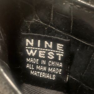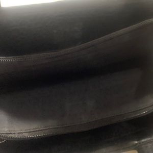 Faux alligator in black several sections some with zippers front pocket has a magnetic metal closure